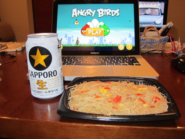Back home to a dinner of spicy noodles, Sapporo beer, Angry